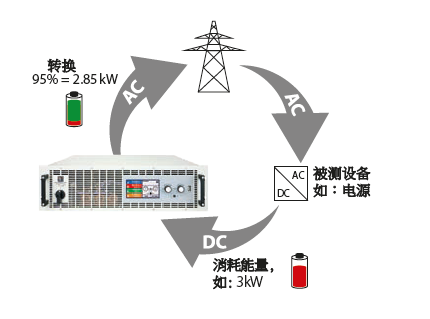 本負(fù)載最主要的特點(diǎn)是其AC輸入端,即電網(wǎng)連接端,也可用作直流電返回的輸出端,轉(zhuǎn)換效率高達(dá)95%。這種能量轉(zhuǎn)換方式有助于降低用電成本,且避免使用昂貴的制冷系統(tǒng),因?yàn)槠胀娮迂?fù)載使用過(guò)程中會(huì)將直流輸入電量轉(zhuǎn)化成熱量,從而需要制冷系統(tǒng)進(jìn)行冷卻。