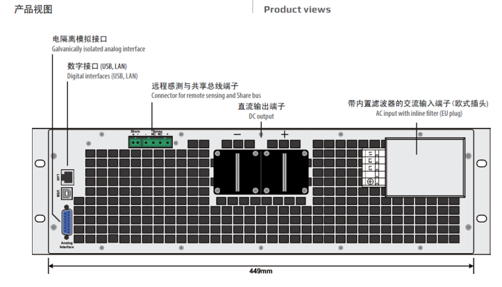所有型號在其后板默認有兩個電隔離數字接口(標準版:1x USB & 1x Ethernet,帶3W選項的:1xUSB & 1x GPIB)??赏ㄟ^發送SCPI語言指令或ModBus RTU協議,經USB與Ethernet接口,控制和監控產品,而GPIB僅支持SCPI語言。
