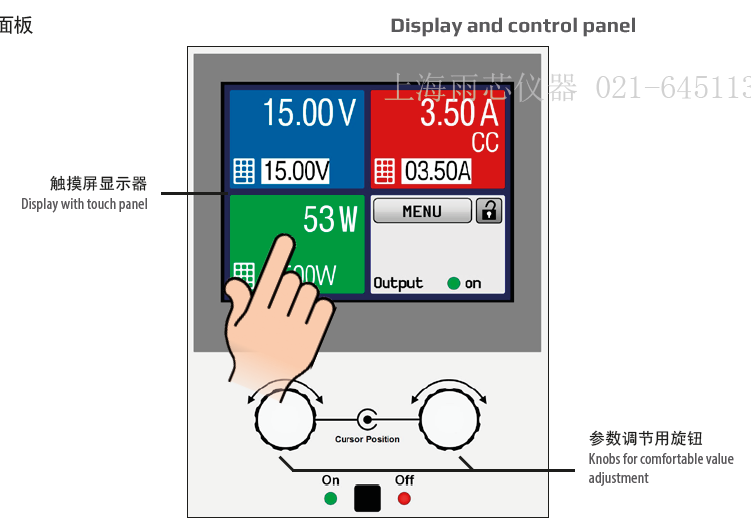 設(shè)定與實(shí)際輸出電壓、電流與功率都清晰顯示于圖形顯示器上。彩色的TFT屏幕為點(diǎn)觸式,用一個(gè)手指就能控制所有功能。通過旋鈕或者數(shù)字鍵盤直接輸入?yún)?shù),也可調(diào)節(jié)設(shè)定電壓、電流或功率。若想防止意外操作,可鎖定所有操作鍵。